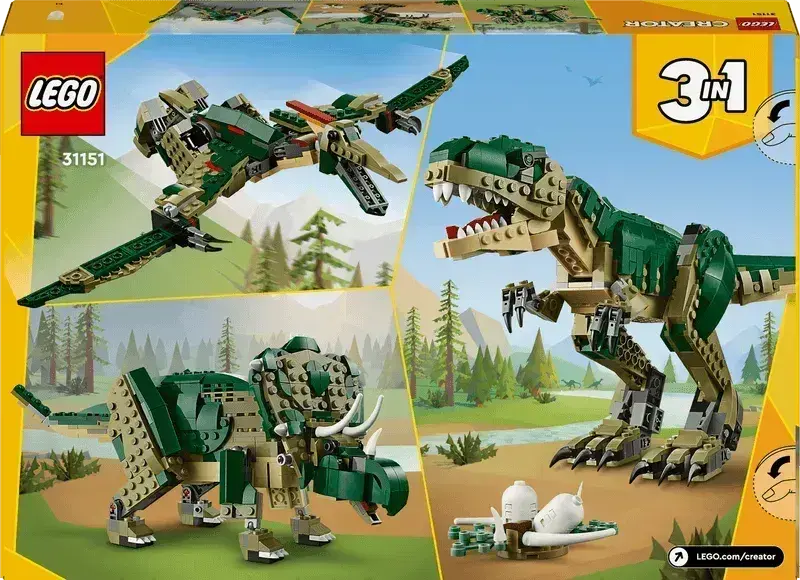 Deze fantastische LEGO Creator 3-in-1 set (31151) laat kinderen vanaf 9 jaar drie verschillende dino’s bouwen: een angstaanjagende Tyrannosaurus Rex, een stoere Triceratops of een rappe Velociraptor. Met deze set beleven ze urenlang plezierig en creatief speelplezier.