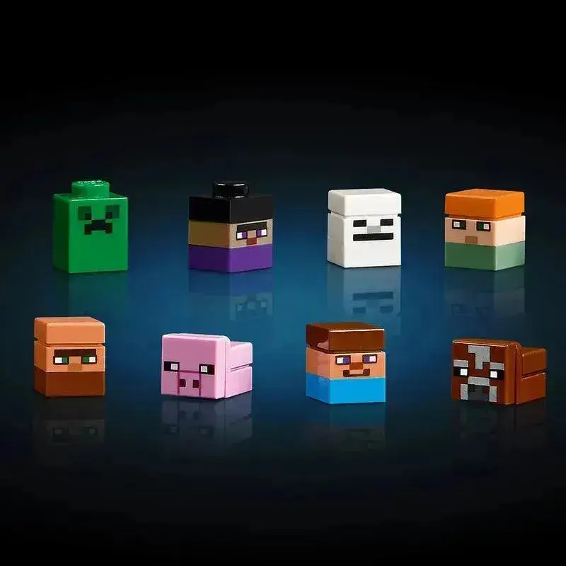 - Een open kubusmodel van de werkbank met 8 microfiguren en 5 minibouwmodules met 12 Minecraft biomen: