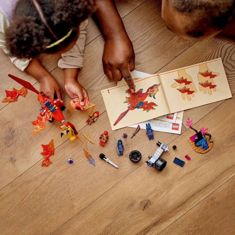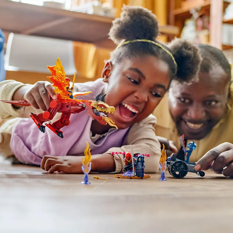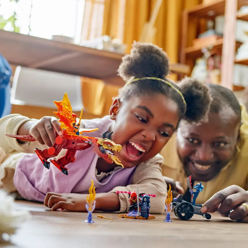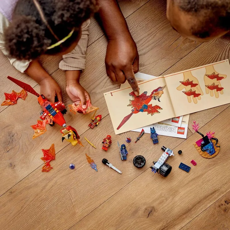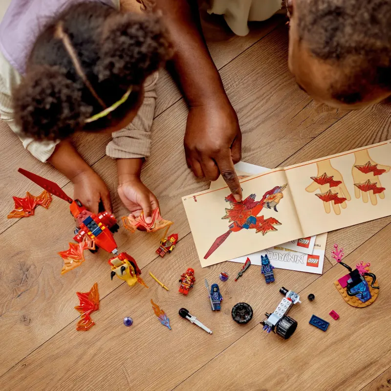 Met de speelset LEGO® NINJAGO® Kai’s brondrakenstrijd (71815) leren kinderen vanaf 4 jaar bouwen terwijl ze spannende ninja-avonturen beleven in het NINJAGO universum. Dit actiespeelgoed bestaat uit een rode draak die kinderen kunnen verstellen door de kaak, kop, staart, poten en 4 vleugels te bewegen. Kinderen kunnen ook een vuurelement in zijn bek plaatsen om schurken bang te maken.