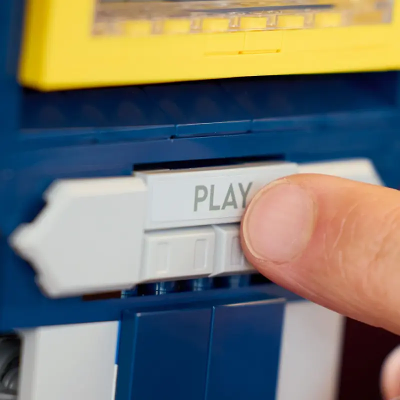 Ongelooflijke Details en Authentieke Vormgeving: Met maar liefst 1397 steentjes (een schatting gebaseerd op vergelijkbare LEGO Icons Transformer-sets, het exacte aantal kan variëren), zit deze Soundwave boordevol authentieke details. Van de herkenbare blauwe en grijze kleurstelling tot de kenmerkende schouderkanon en blaster, elk aspect van Soundwave’s iconische uiterlijk is met uiterste precisie vastgelegd. De cassettebandrecorder-modus heeft zelfs een functionerend ‘cassettedeck’ waar zijn trouwe minion in past!